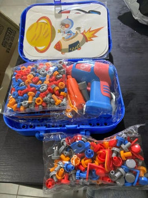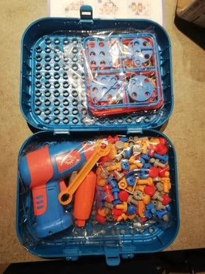 The set features a drill, screws, design cards, building tools, and a carrying case, all designed for fun and educational play.